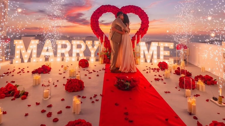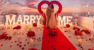 A breathtaking, luxury-style proposal setup designed for couples who want a dramatic, romantic, and unforgettable “Will you marry me?” moment.